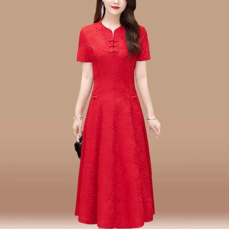 Red baju kurung ala cheongsam style with pants women s fashion.